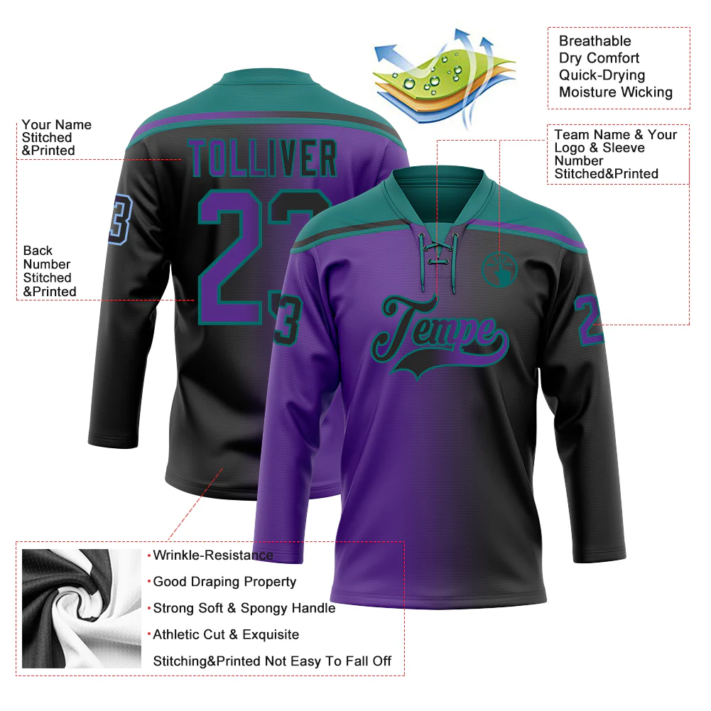 Custom Black Purple-Teal Gradient Fashion Hockey Lace Neck Jersey