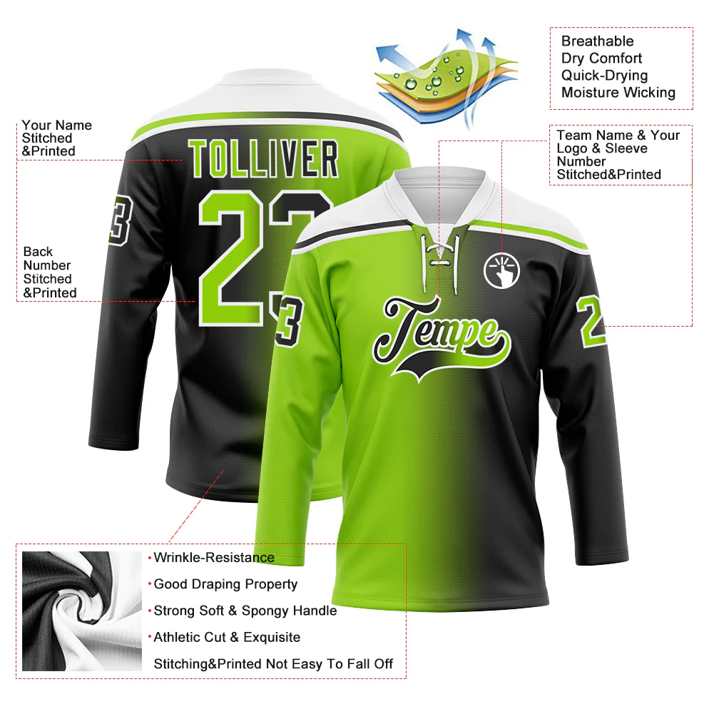 Custom Black Neon Green-White Gradient Fashion Hockey Lace Neck Jersey