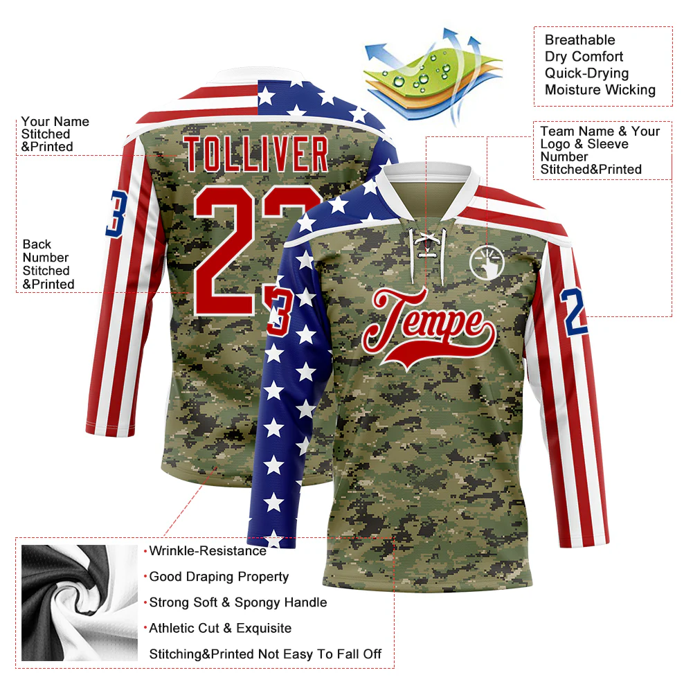 Custom Camo Red Royal-White American Flag Camouflage Hockey Lace Neck Jersey