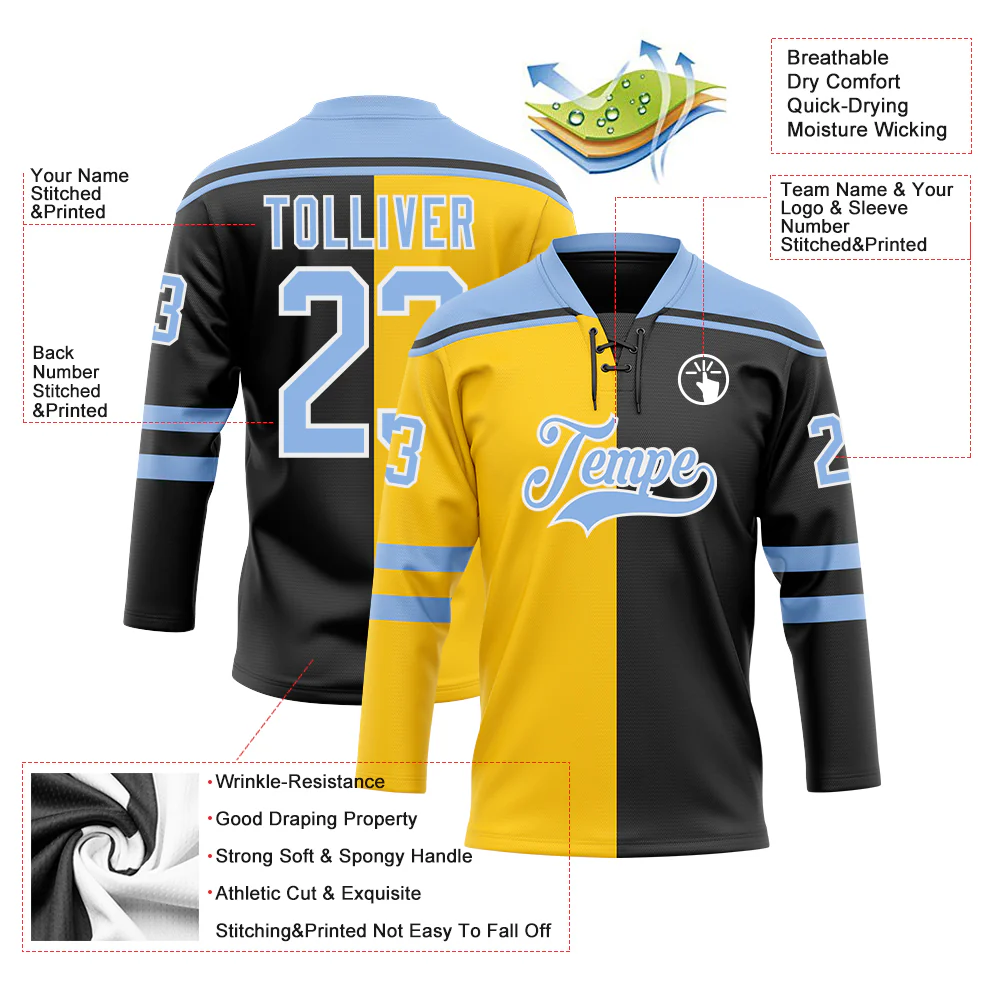 Custom Black Light Blue Yellow-White Split Fashion Hockey Lace Neck Jersey