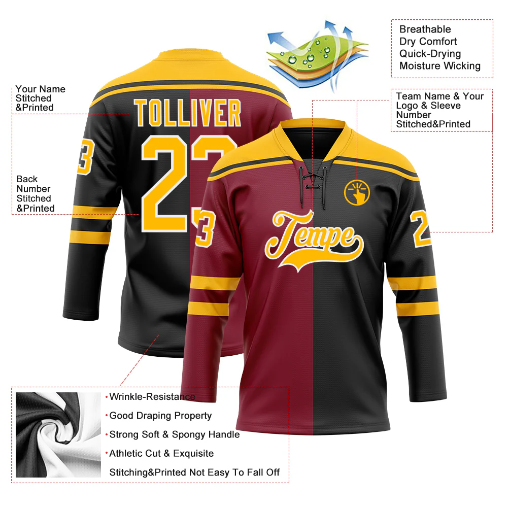 Custom Black Gold Crimson-White Split Fashion Hockey Lace Neck Jersey