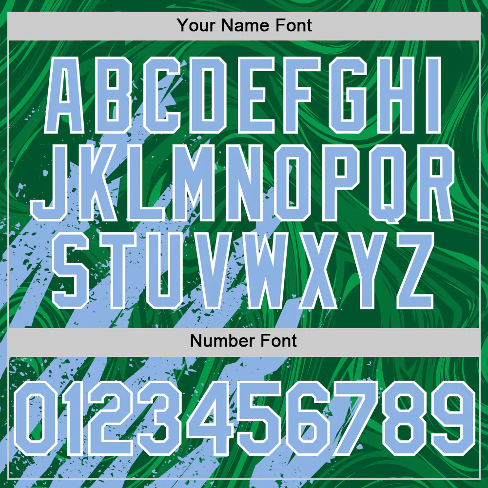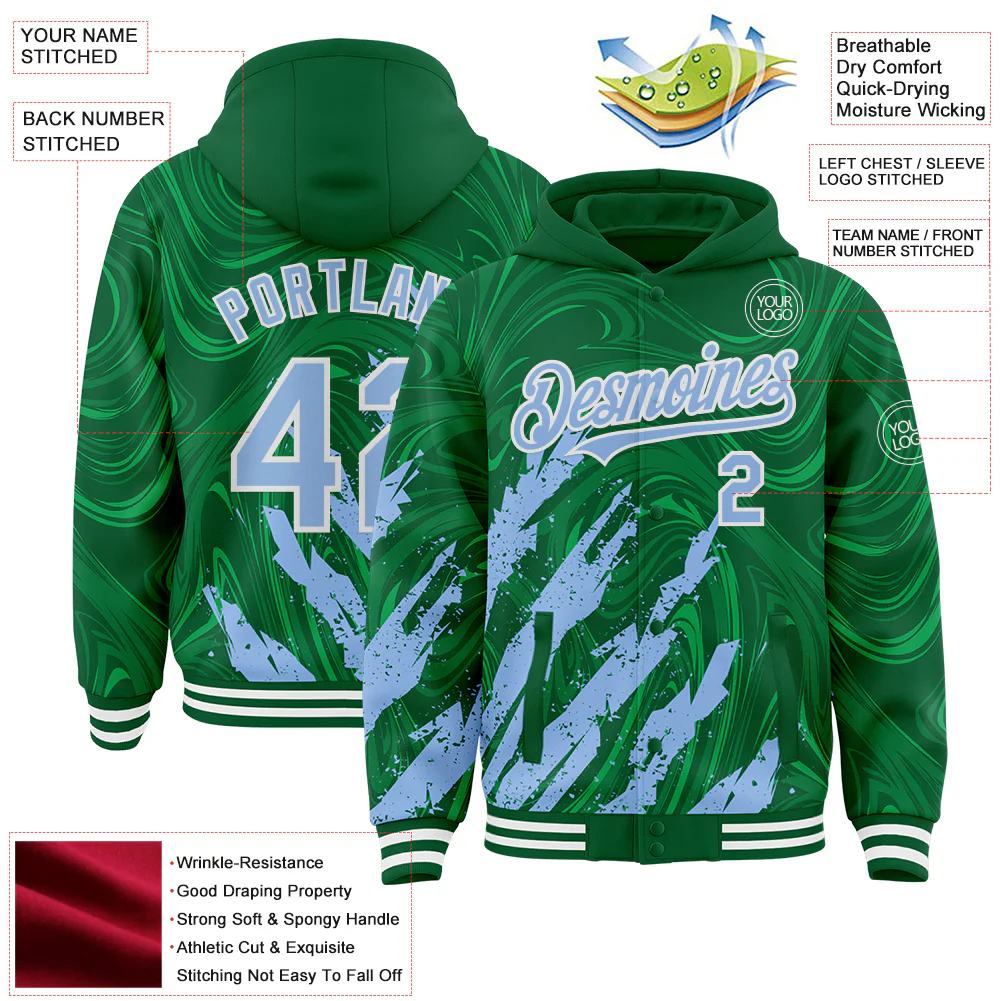 Custom Kelly Green Light Blue-White Splash 3D Pattern Design Bomber Full-Snap Varsity Letterman Hoodie Jacket