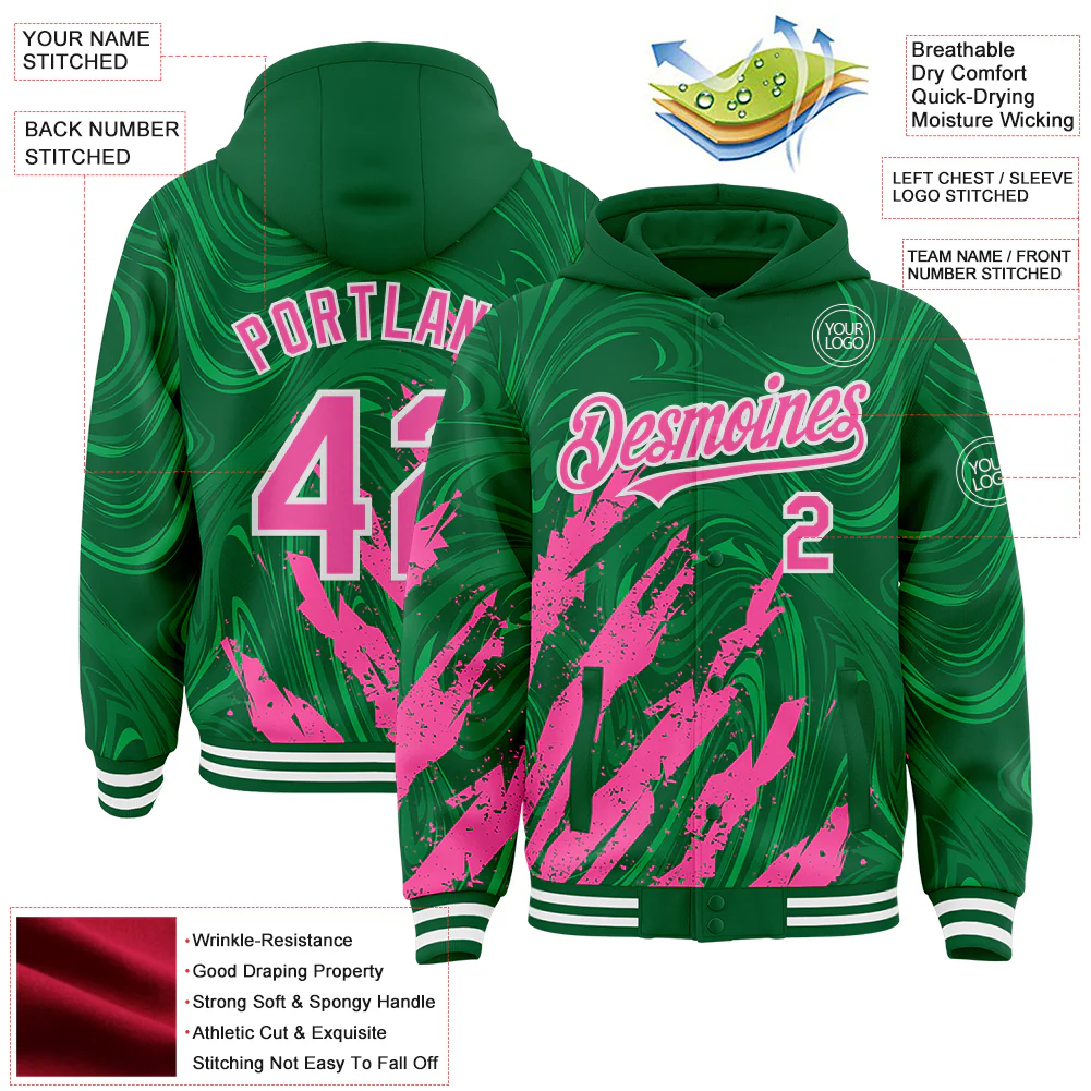 Custom Kelly Green Pink-White Splash 3D Pattern Design Bomber Full-Snap Varsity Letterman Hoodie Jacket